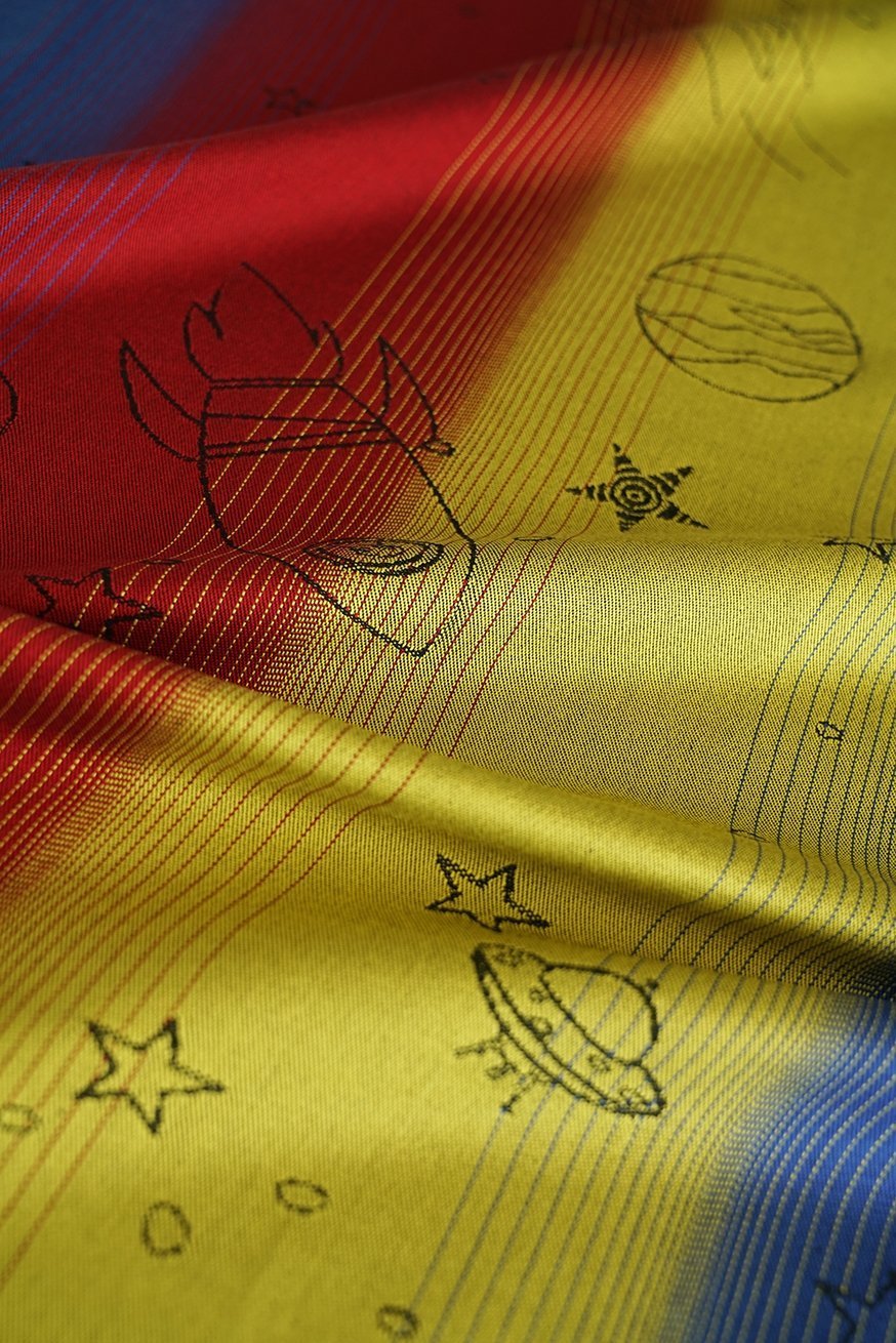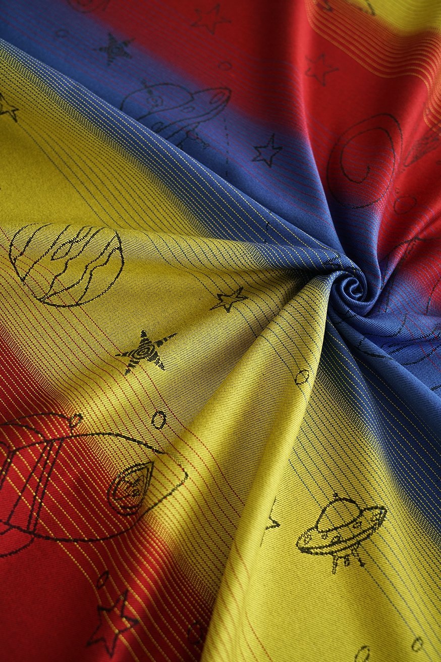 Ljusa färger i den kontrasterande färggradienten, extraordinär design, bekant kvalitet. Trevligt tyg. Kan vara bindande super.