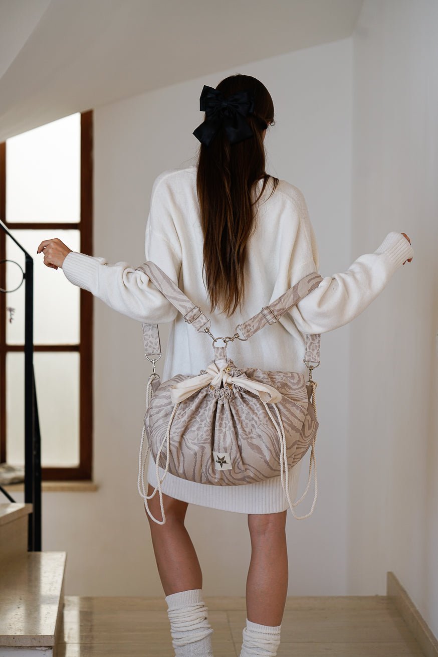 Von zarten Leoparden-Prints bis hin zu edlen Streifen erinnert das Design an die Stärke und Anmut der Tierwelt. Die zurückhaltende Farbpalette in sanftem Creme sorgt dafür, dass die Tasche mit jedem Outfit harmoniert – ein stilvoller Begleiter für jeden Anlass.